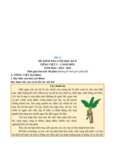 - Tailieugiaovien.com.vn giới thiệu bộ 10 đề Cuối kì 2 gồm đầy đủ ma trận và lời giải chi tiết môn Tiếng Việt lớp 5 Cánh diều mới nhất năm 2025 nhằm giúp Giáo viên có thêm tài liệu tham khảo ra đề thi Tiếng Việt lớp 5.