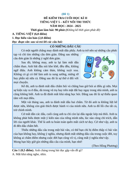Bộ 10 đề thi Cuối kì 2 Tiếng Việt lớp 5 Kết nối tri thức có đáp án