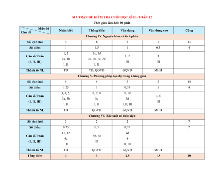Chương IV. Nguyên hàm và tích phân Số lệnh hỏi 4 6 2 1 13 Số điểm 1 1,5 1 0,5 4 1, 2 1c, 1d Câu số/Phần 1, 2 3 1a, 1b 2a, 2b, 2c, 2d (I, II, III) III III I, II I, II Thành tố NL TD TD, QGVĐ GQVĐ MHH
