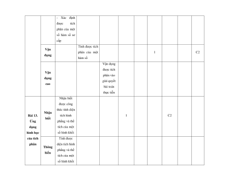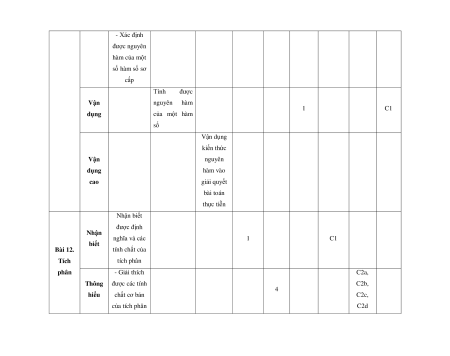 Chương IV. Nguyên hàm và tích phân - Nhận biết được khái niệm nguyên hàm của một Nhận C1a, số 2 biết C1b - Nhận biết Bài 11. được tính Nguyên chất của hàm nguyên hàm - Giải thích được các tính Thông C1c, chất cơ bản 2 hiểu C1d của nguyên hàm - Xác định được nguyên hàm của một số hàm số sơ cấp Tính được Vận nguyên hàm 1 C1 dụng của một hàm số Vận dụng kiến thức Vận nguyên dụng hàm vào cao giải quyết bài toán thực tiễn Nhận biết được định Nhận nghĩa và các 1 C1 biết Bài 12. tính chất của Tích tích phân phân - Giải thích C2a, Thông được các tính C2b, 4 hiểu chất cơ bản C2c, của tích phân C2d