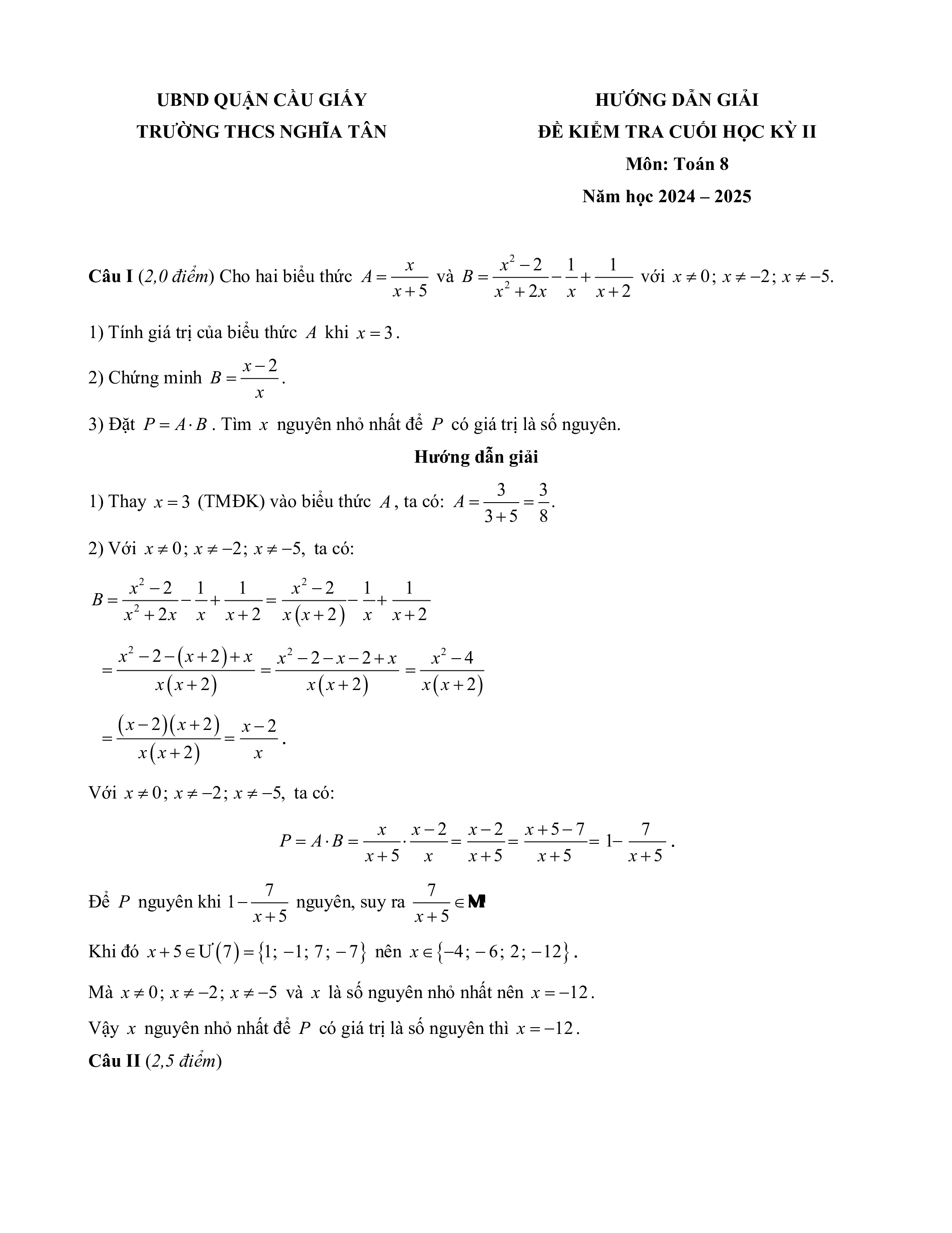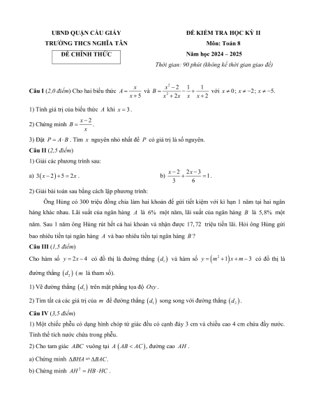 TRƯƠNG THCS NGHIA TÂN Môn: Toán 8 ĐÊ CHINH THƯC