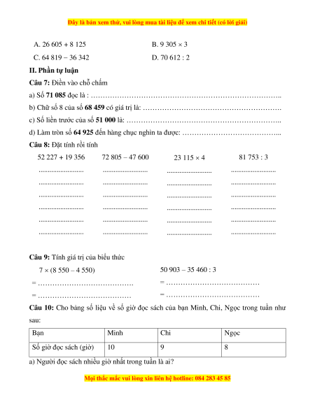 A. 26 605 + 8 125 B. 9 305 3 C. 64 819 − 36 342 D. 70 612 : 2 II. Phần tự luận