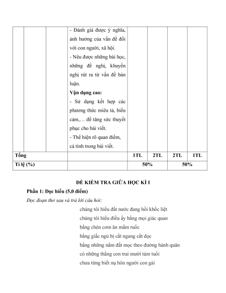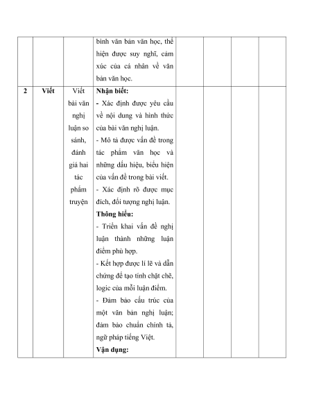 Thông hiểu Vận dụng % cao Năng 1 lực Thơ trữ tình 1 2 2 0 50 Đọc Viết bài văn Năng nghị luận so 2 lực sánh, đánh giá 1* 1* 1* 1* 50 Viết hai tác phẩm truyện Tổng 15 35 40 10 100 Tỉ lệ % 50% 50%