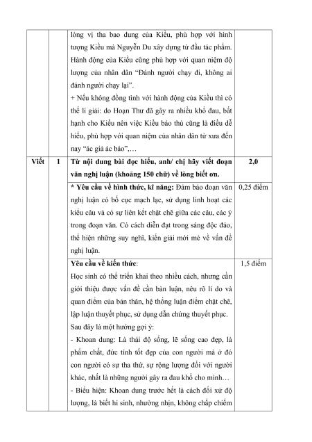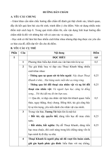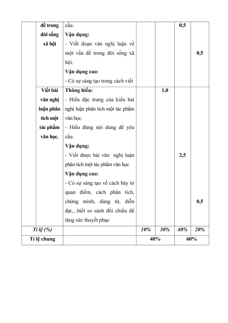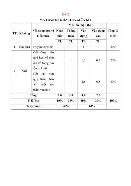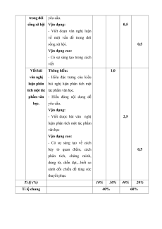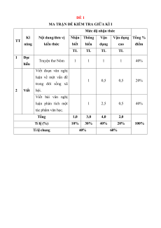 Mức độ nhận thức Kĩ Nội dung/đơn vị Nhận Thông Vận Vận dụng Tổng % TT năng kiến thức biết hiểu dụng cao điểm TL TL TL TL 1 Đọc Truyện thơ Nôm 1 1 1 1 40% hiểu Viết đoạn văn nghị luận về một vấn đề 1 0,5 0,5 20% trong đời sống xã 2 Viết hội. Viết bài văn nghị luận phân tích một 1 2,5 0,5 40% tác phẩm văn học. Tổng 1,0 3,0 4,0 2,0 Ti lê (%) 10% 30% 40% 20% 100% Ti lê chung 40% 60%