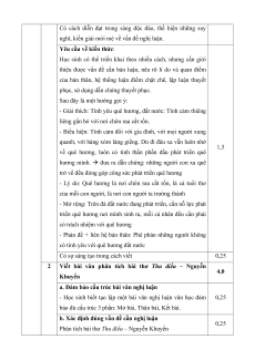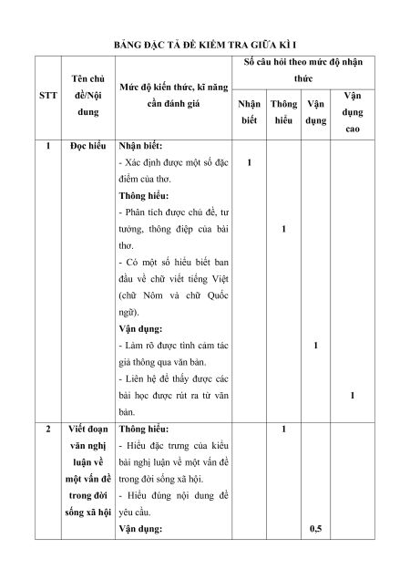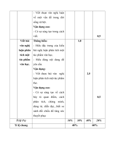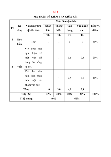 TT năng vị kiến thức biết hiểu dụng cao điểm TL TL TL TL 1 Đọc Thơ 1 1 1 1 40% hiểu Viết đoạn văn nghị luận về một vấn đề 1 0,5 0,5 20% trong đời sống 2 Viết xã hội. Viết bài văn nghị luận phân 1 2,5 0,5 40% tích một tác phẩm văn học. Tổng 1,0 3,0 4,0 2,0 Ti lê (%) 10% 30% 40% 20% 100% Ti lê chung 40% 60%