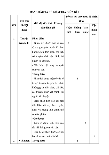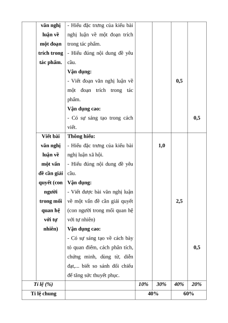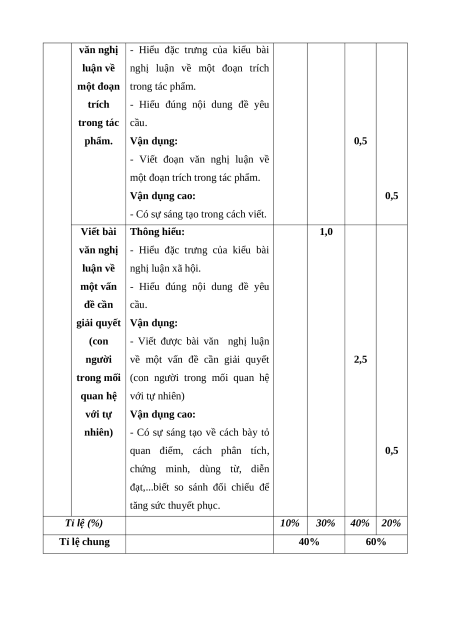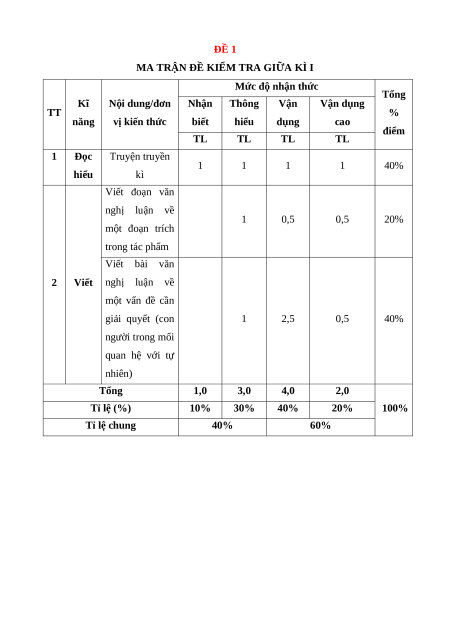 Mức độ nhận thức Tổng Kĩ Nội dung/đơn Nhận Thông Vận Vận dụng TT % năng vị kiến thức biết hiểu dụng cao điểm TL TL TL TL 1 Đọc Truyện truyền 1 1 1 1 40% hiểu kì Viết đoạn văn nghị luận về 1 0,5 0,5 20% một đoạn trích trong tác phẩm Viết bài văn 2 Viết nghị luận về một vấn đề cần giải quyết (con 1 2,5 0,5 40% người trong mối quan hệ với tự nhiên) Tổng 1,0 3,0 4,0 2,0 Tỉ lệ (%) 10% 30% 40% 20% 100% Tỉ lệ chung 40% 60%