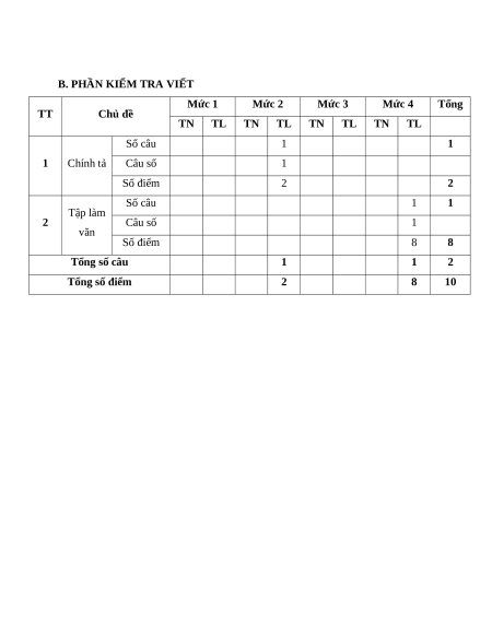 B. PHẦN KIỂM TRA VIẾT Mức 1 Mức 2 Mức 3 Mức 4 Tổng TT Chủ đề TN TL TN TL TN TL TN TL Số câu 1 1 1 Chính tả Câu số 1 Số điểm 2 2 Số câu 1 1 Tập làm 2 Câu số 1 văn Số điểm 8 8 Tổng số câu 1 1 2 Tổng số điểm 2 8 10