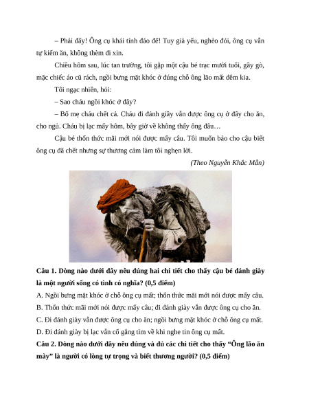 Câu 1. Dòng nào dưới đây nêu đúng hai chi tiết cho thấy cậu bé đánh giày