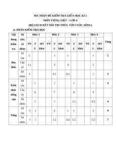 A. PHẦN KIỂM TRA ĐỌC Nội Số Mức 1 Mức 2 Mức 3 Mức 4 dung câu, Tổng kiểm số TN T HT TN T HT TN T HT TN T HT tra điểm L khác L khác L khác L khác Số 2 1 1 1 5 câu Đọc Câu 1,2 3 4 5 hiểu số Số 1 0.5 0,5 1 3 điểm Số 1 1 1 1 4 Kiến câu thức Câu 6 7 8 9 tiếng số việt Số 1 1 1,5 0,5 4 điểm Số 2 1 2 1 1 2 9 câu Tổng Số 1 1 1,5 0,5 1,5 1,5 7 điểm