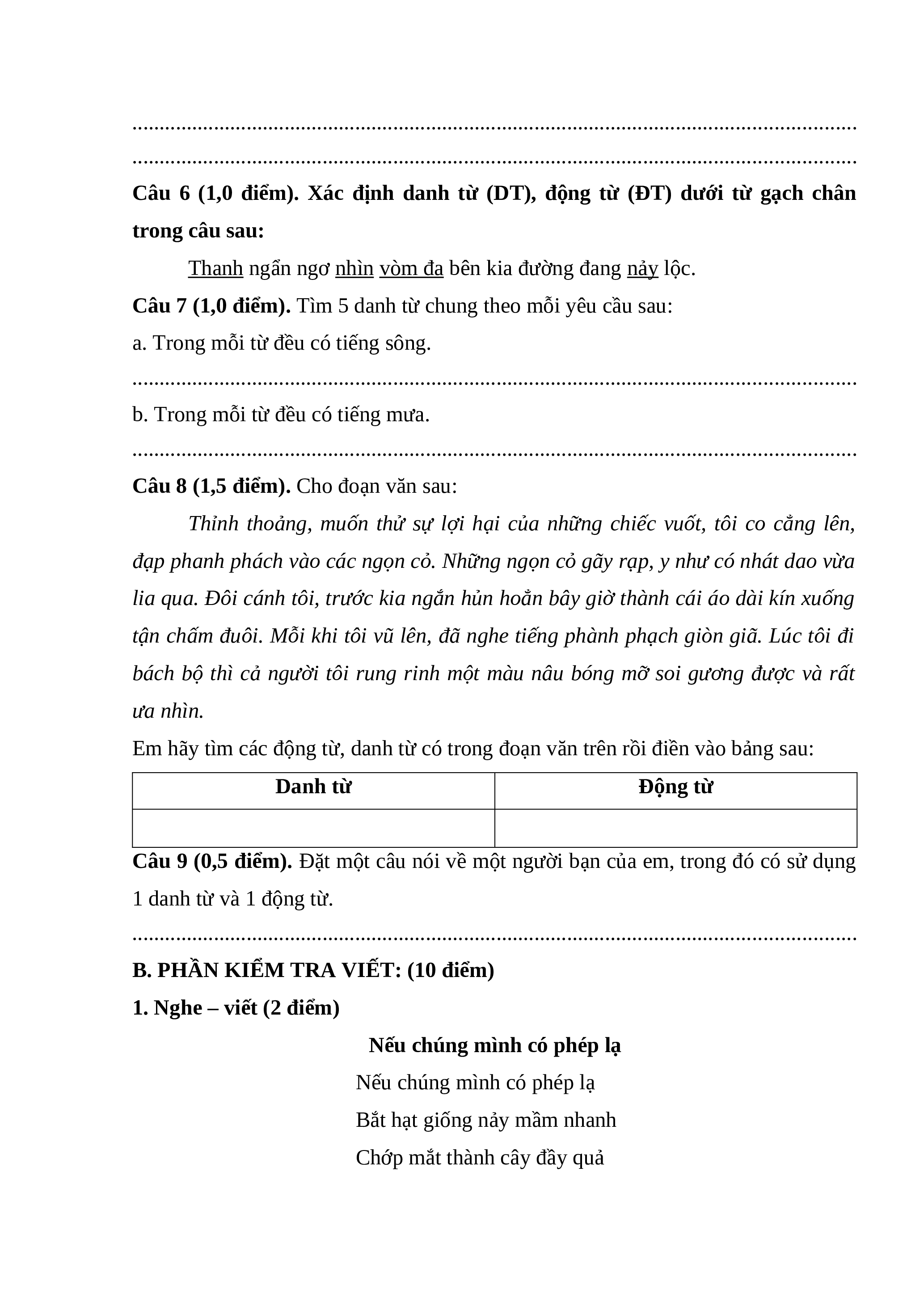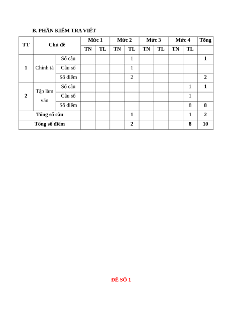 B. PHẦN KIỂM TRA VIẾT Mức 1 Mức 2 Mức 3 Mức 4 Tổng TT Chủ đề TN TL TN TL TN TL TN TL Số câu 1 1 1 Chính tả Câu số 1 Số điểm 2 2 Số câu 1 1 Tập làm 2 Câu số 1 văn Số điểm 8 8 Tổng số câu 1 1 2 Tổng số điểm 2 8 10 ĐỀ SỐ 1