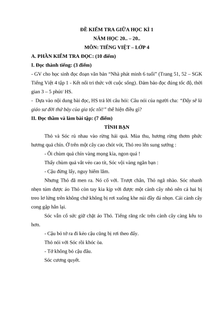 Tiếng Việt 4 tập 1 - Kết nối tri thức với cuộc sống). Đảm bảo đọc đúng tốc độ, thời gian 3 – 5 phút/ HS.