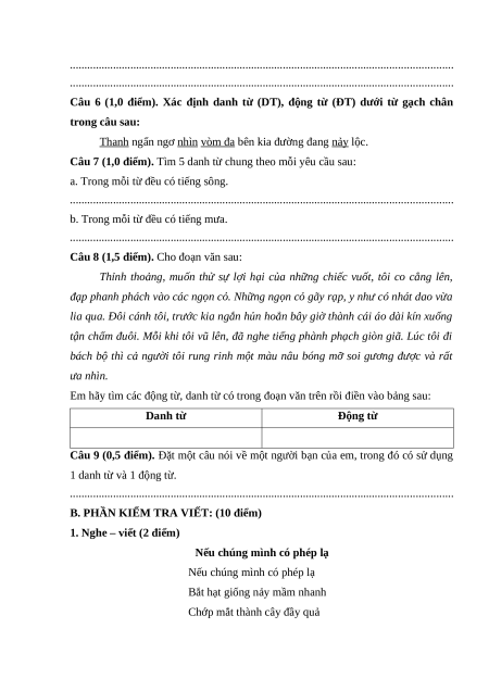 B. PHẦN KIỂM TRA VIẾT Mức 1 Mức 2 Mức 3 Tổng TT Chủ đề TN TL TN TL TN TL Số câu 1 1 1 Chính tả Câu số 1 Số điểm 4 4 Số câu 1 1 Tập làm 2 Câu số 2 văn Số điểm 6 6 Tổng số câu 1 1 2 Tổng số điểm 4 6 10 ĐỀ SỐ 1