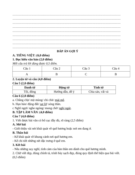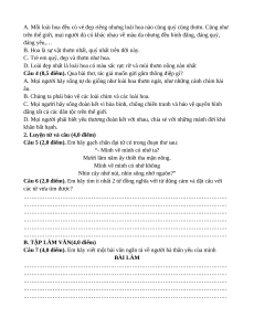 2. Luyện từ và câu (4,0 điểm) Câu 5 (2,0 điểm) Danh từ Động từ Tính từ Tối, đông Hướng dẫn, để ý Chia sản, vất vả Câu 6 (2,0 điểm)