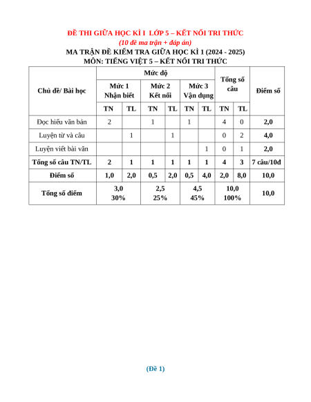 MÔN: TIẾNG VIỆT 5 – KẾT NỐI TRI THỨC Mức độ Tổng số Mức 1 Mức 2 Mức 3 Chủ đề/ Bài học câu Điểm số Nhận biết Kết nối Vận dụng TN TL TN TL TN TL TN TL Đọc hiểu văn bản 2 1 1 4 0 2,0 Luyện từ và câu 1 1 0 2 4,0 Luyện viết bài văn 1 0 1 2,0 Tổng số câu TN/TL 2 1 1 1 1 1 4 3 7 câu/10đ Điểm số 1,0 2,0 0,5 2,0 0,5 4,0 2,0 8,0 10,0 3,0 2,5 4,5 10,0 Tổng số điểm 10,0 30% 25% 45% 100% (Đề 1)