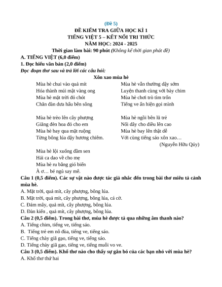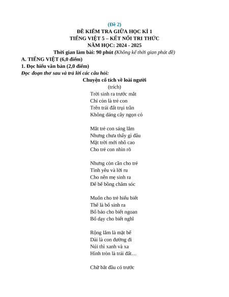 ĐỀ THI GIỮA HỌC KÌ I LỚP 5 – KẾT NỐI TRI THỨC