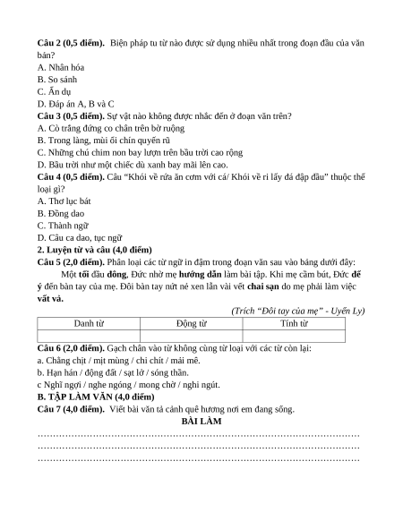 Câu 2 (0,5 điểm). Biện pháp tu từ nào được sử dụng nhiều nhất trong đoạn đầu của văn bản? A. Nhân hóa B. So sánh C. Ẩn dụ D. Đáp án A, B và C