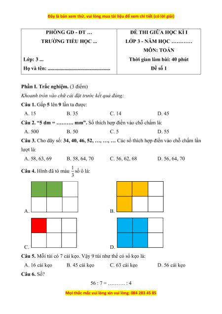 Câu 5. Mỗi túi có 7 cái kẹo. Vậy 9 túi như thế có số kẹo là: A. 16 cái kẹo B. 45 cái kẹo C. 63 cái kẹo D. 56 cái kẹo Câu 6. Số? 56 : 7 = ………. : 4