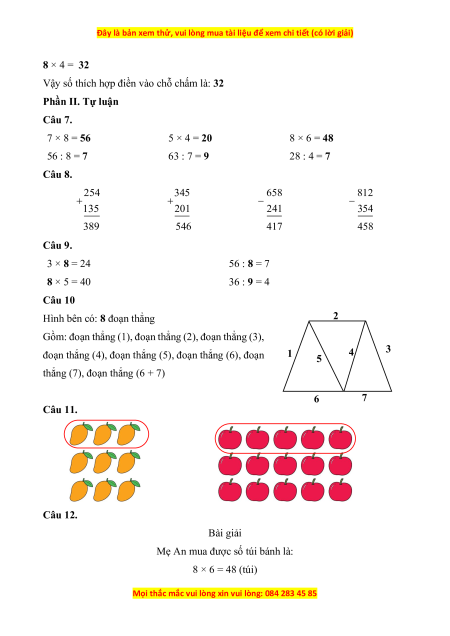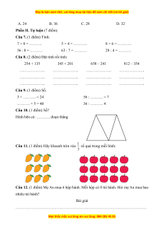 Phần II. Tự luận Câu 7. 7 × 8 = 56 5 × 4 = 20 8 × 6 = 48 56 : 8 = 7 63 : 7 = 9 28 : 4 = 7 Câu 8. 254 345 658 812 + + − − 135 201 241 354 389 546 417 458 Câu 9. 3 × 8 = 24 56 : 8 = 7 8 × 5 = 40 36 : 9 = 4 Câu 10