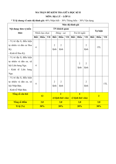 * Tỉ lệ chung về mức độ đánh giá: 40% Nhận biết – 30% Thông hiểu – 30% Vận dụng. Mức độ đánh giá