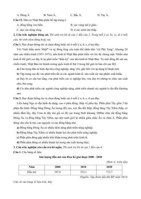 Câu 2. Người dân Hoa Kỳ chủ yếu sinh sống ở các A. đô thị cực lớn. B. đô thị vừa và nhỏ. C. vùng ven đô thị. D. vùng nông thôn.