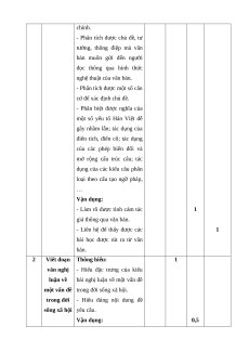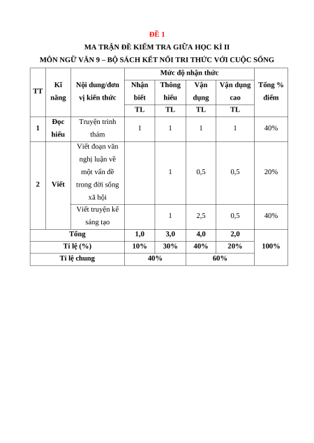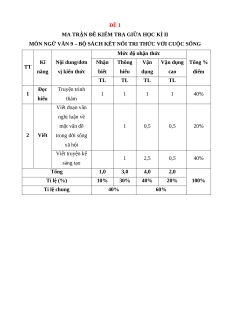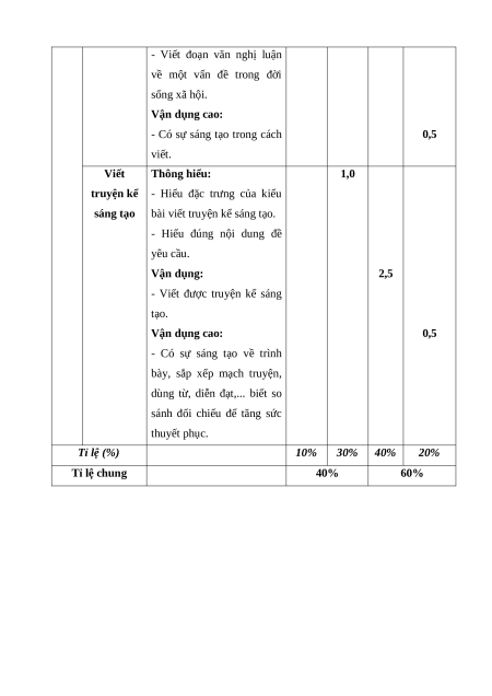 TT năng vị kiến thức biết hiểu dụng cao điểm TL TL TL TL Đọc Truyện trinh 1 1 1 1 1 40% hiểu thám Viết đoạn văn nghị luận về một vấn đề 1 0,5 0,5 20% 2 Viết trong đời sống xã hội Viết truyện kể 1 2,5 0,5 40% sáng tạo Tổng 1,0 3,0 4,0 2,0 Tỉ lệ (%) 10% 30% 40% 20% 100% Tỉ lệ chung 40% 60%