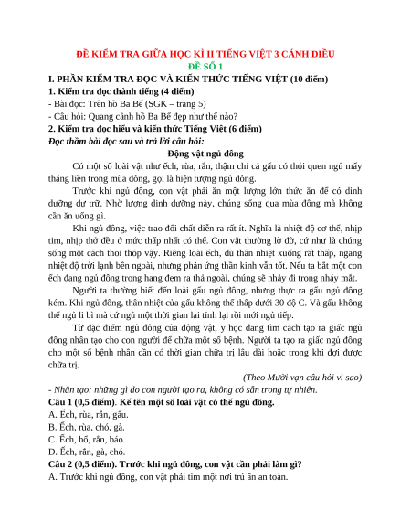 ĐỀ KIỂM TRA GIỮA HỌC KÌ II TIẾNG VIỆT 3 CÁNH DIỀU ĐỀ SỐ 1