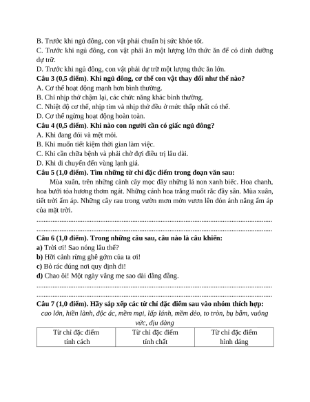 Câu 7 (1,0 điểm). Hãy sắp xếp các từ chỉ đặc điểm sau vào nhóm thích hợp: