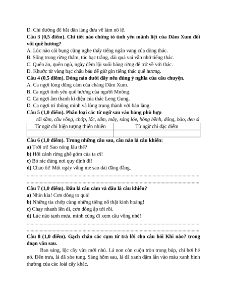 Câu 1 (0,5 điểm). Âm thanh của dòng thác Leng Gung có gì đặc biệt?