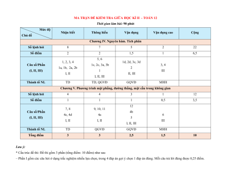 MA TRẬN ĐỀ KIỂM TRA GIỮA HỌC KÌ II - TOÁN 12