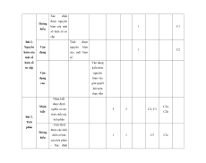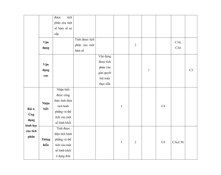 Chương IV. Nguyên hàm. Tích phân - Nhận biết được khái niệm nguyên hàm của một Nhận C1a, số 1 2 C1 biết C1b - Nhận biết Bài 1. được tính Nguyên chất của hàm nguyên hàm - Giải thích được các tính Thông chất cơ bản 1 C1c hiểu của nguyên hàm Xác định được nguyên Thông hàm của một 1 C1 hiểu số hàm số sơ cấp Bài 2. Tính được Nguyên Vận nguyên hàm 1 C2 hàm của dụng của một hàm một số số hàm số Vận dụng sơ cấp kiến thức Vận nguyên dụng hàm vào cao giải quyết bài toán thực tiễn Nhận biết được định Nhận C2a, nghĩa và các 2 2 C2, C3 biết C2b tính chất của Bài 3. tích phân Tích - Giải thích phân được các tính Thông chất cơ bản 1 1 C5 C2c hiểu của tích phân - Xác định