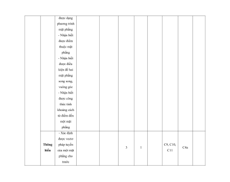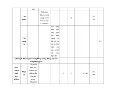 Chương V. Phương trình mặt phẳng, đường thẳng, mặt cầu trong không gian Số lệnh hỏi 4 4 3 1 12 Số điểm 1 1 1 0,5 3,5 12 7, 8 9, 10, 11 Câu số/Phần 4b 4c, 4d 4a 6 (I, II, III) 5 I, II I, II III I, II, III Thành tố NL TD QGVĐ GQVĐ MHH Tổng điểm 3 3 2,5 1,5 10 Lưu ý: