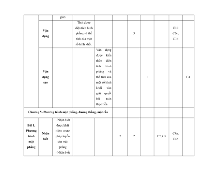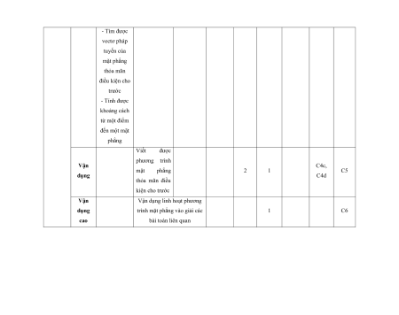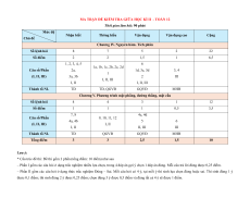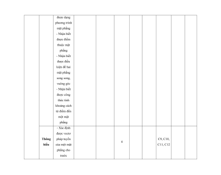 Chương V. Phương trình mặt phẳng, đường thẳng, mặt cầu Số lệnh hỏi 4 4 3 1 12 Số điểm 1 1 1 0,5 3,5 7, 8 4c, 4d Câu số/Phần 9, 10, 11, 12 4a, 4b 5 6 (I, II, III) I, II I, II II, III III Thành tố NL TD QGVĐ GQVĐ MHH Tổng điểm 3 3 2,5 1,5 10 Lưu ý: