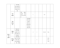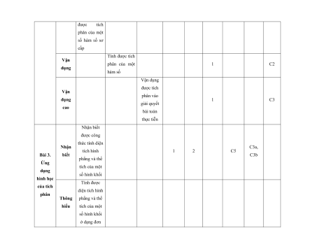 Chương IV. Nguyên hàm. Tích phân - Nhận biết được khái niệm nguyên hàm của một Nhận số 2 C1, C2 biết - Nhận biết Bài 1. được tính Nguyên chất của hàm nguyên hàm - Giải thích được các tính C1a, Thông chất cơ bản 3 1 C1b, C1 hiểu của nguyên C1c hàm - Xác định được nguyên hàm của một số hàm số sơ cấp Tính được Vận nguyên hàm 1 C6 dụng của một hàm số Vận dụng kiến thức Vận nguyên dụng hàm vào cao giải quyết bài toán thực tiễn Nhận biết được định Nhận nghĩa và các 2 1 C3, C4 C2a biết tính chất của Bài 2. tích phân Tích - Giải thích phân được các tính C2b, Thông chất cơ bản 3 C2c, hiểu của tích phân C2d - Xác định