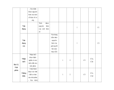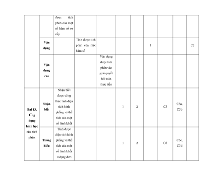 Chương IV. Nguyên hàm và tích phân - Nhận biết được khái niệm nguyên hàm của một Nhận C1a, số 1 2 C1 biết C1b - Nhận biết Bài 11. được tính Nguyên chất của hàm nguyên hàm - Giải thích được các tính Thông C1c, chất cơ bản 1 2 C4 hiểu C1d của nguyên hàm - Xác định được nguyên hàm của một số hàm số sơ cấp Tính được Vận nguyên hàm 1 C1 dụng của một hàm số Vận dụng kiến thức Vận nguyên dụng hàm vào 1 C3 cao giải quyết bài toán thực tiễn Nhận biết được định Nhận C2a, nghĩa và các 1 2 C2 biết C2b tính chất của Bài 12. tích phân Tích - Giải thích phân được các tính Thông C2c, chất cơ bản 1 2 C5 hiểu C2d của tích phân - Xác định