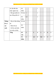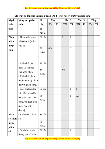 Ma trận đề thi giữa kì 2 môn Toán lớp 4 – Kết nối tri thức với cuộc sống Mạch Năng lực, phẩm Số Mức 1 Mức 2 Mức 3 Tổng kiến chất câu, TN TL TN TL TN TL TN TL thức số điểm Phép - Phép nhân, chia Số câu 1 2 1 nhân, với số có một, hai phép chữ số. Số 0,5 1 2 chia điểm - Tính chất giao Số câu 1 1 hoán và kết hợp Số 0,5 1 của phép nhân. điểm - Tính chất phân phối của phép nhân đối với phép cộng. - Giải bài toán lời Số câu 1 1 văn liên quan đến Số 2 0,5 bài toán trung bình điểm cộng, bài toán liên quan đến rút về đơn vị. Phân - Khái niệm phân Số câu số, khái số niệm Số phân điểm số - So sánh và xếp Số câu 1 thứ tự các số phân