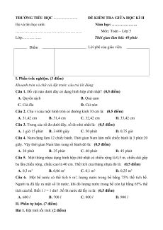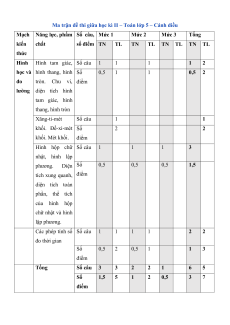 lường diện tích hình tam giác, hình thang, hình tròn Xăng-ti-mét Số câu 1 1 khối. Đề-xi-mét Số 2 2 khối. Mét khối. điểm Hình hộp chữ Số câu 1 1 1 3 nhật, hình lập phương. Diện Số 0,5 0,5 0,5 1,5 tích xung quanh, điểm diện tích toàn phần, thể tích của hình hộp chữ nhật và hình lập phương.
