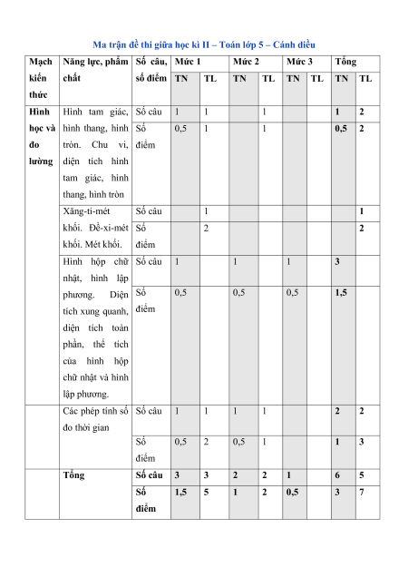 Ma trận đề thi giữa học kì II – Toán lớp 5 – Cánh diều