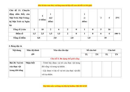 hệ Mặt Trời và Ngân điểm) điểm) hà Tổng số ý/câu 1 10 2 6 2 0 1 0 5 16 Điểm số 1,5 2,5 1,5 1,5 2 0 1 0 6 4 100 % Tổng số điểm 4,0 3,0 2,0 1,0 10 2. Bảng đặc tả Nội dung Mức độ đánh