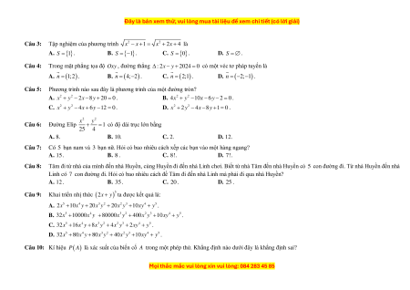 Linh có 7 con đường đi. Hỏi có bao nhiêu cách để Tâm đi đến nhà Linh mà phải đi qua nhà Huyền? A. 12 . B. 35 . C. 20 . D. 25 . Câu 9: Khai triển nhị thức ( + )5 2x y
