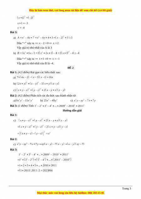 Bài 3: (1 điểm) Tìm giá trị nhỏ nhất của các đa thức sau: a) b) Hướng dẫn giải Bài 2: c) Trang 2