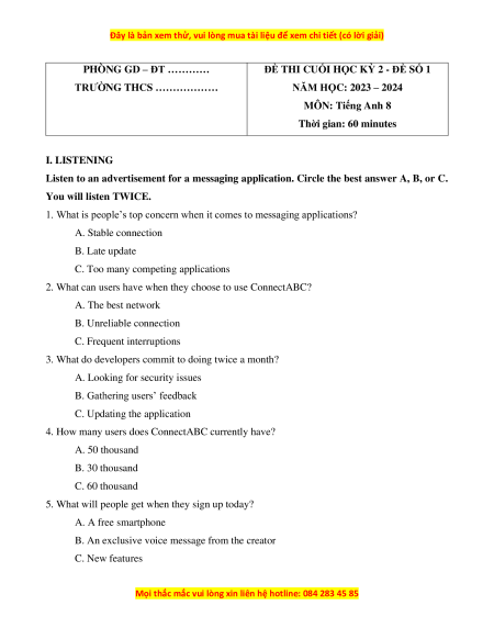 NĂM HỌC: 2023 – 2024 MÔN: Tiếng Anh 8