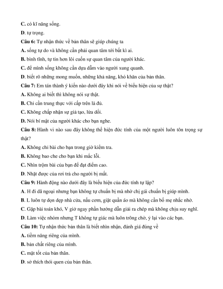 Câu 10: Tự nhận thức bản thân là biết nhìn nhận, đánh giá đúng về