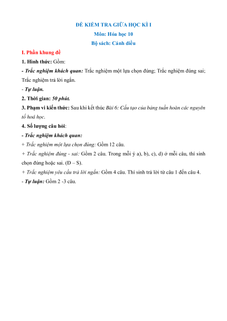 - Tailieugiaovien.com.vn giới thiệu bộ 11 đề thi giữa kì 1 gồm 3 đề cấu trúc mới có tự luận form 2025; 8 đề có đầy đủ ma trận và lời giải chi tiết Hóa học 10 Cánh diều mới nhất năm 2023 - 2024 nhằm giúp Giáo viên có thêm tài liệu tham khảo ra đề thi Hóa học lớp 10.