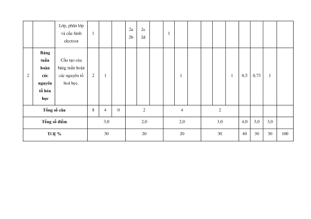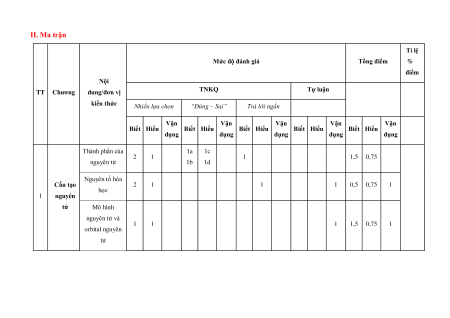Mức độ đánh giá Tổng điểm % điểm Nội TNKQ Tự luận TT Chương dung/đơn vi ̣ kiến thức Nhiều lựa chọn “Đúng – Sai” Trả lời ngắn Vận Vận Vận Vận Vận Biết Hiểu Biết Hiểu Biết Hiểu Biết Hiểu Biết Hiểu dụng dụng dụng dụng dụng Thành phần của 1a 1c 2 1 1 1,5 0,75 nguyên tử 1b 1d Nguyên tố hóa Cấu tạo 2 1 1 1 0,5 0,75 1 học 1 nguyên tử Mô hình nguyên tử và 1 1 1 1,5 0,75 1 orbital nguyên tử Lớp, phân lớp 2a 2c và cấu hình 1 1 2b 2d electron Bảng tuần Cấu tạo của hoàn bảng tuần hoàn 2 các các nguyên tố 2 1 1 1 0,5 0,75 1 nguyên hoá học. tố hóa học Tổng số câu 8 4 0 2 4 2 Tổng số điểm 3,0 2,0 2,0 3,0 4,0 3,0 3,0 Tỉ lệ % 30 20 20 30 40 30 30 100 III. Đề kiểm tra Sở GD- ĐT …