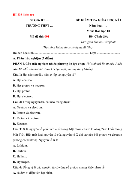 ĐỀ KIỂM TRA GIỮA HỌC KÌ I TRƯỜNG THPT … Năm học:….. Môn: Hóa học 10 Mã đề thi: 001 Bộ: Cánh diều