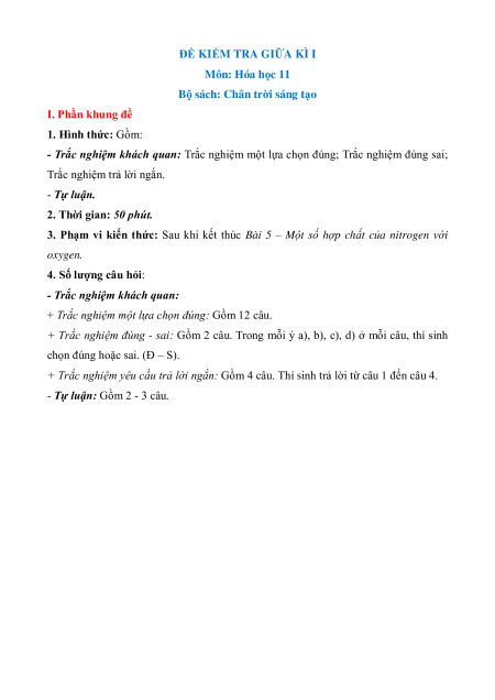 => Tham khảo thêm: Bộ 11 đề thi giữa kì 1 Hóa Học 11 Chân trời sáng tạo cấu trúc mới