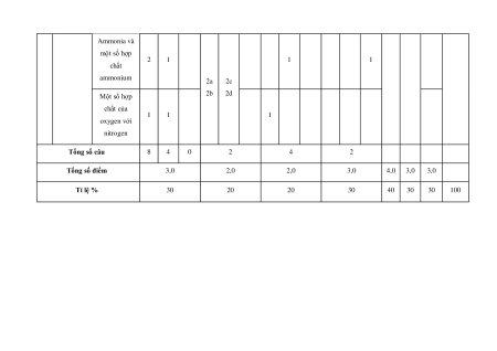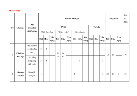 Mức độ đánh giá Tổng điểm % điểm Nội TNKQ Tự luận TT Chương dung/đơn vi ̣kiến thức Nhiều lựa chọn “Đúng – Sai” Trả lời ngắn Vận Vận Vận Vận Vận Biết Hiểu Biết Hiểu Biết Hiểu Biết Hiểu Biết Hiểu dụng dụng dụng dụng dụng Khái niệm về cân bằng hóa 2 1 Cân bằng học 1a 1c 1 1,5 1,5 40 hóa học 1b 1d Cân bằng trong dung 2 1 1 1 1 dịch nước Nitrogen Đơn chất 2 1 1 1 2,5 1,5 2 60 - Sulfur nitrogen Ammonia và một số hợp 2 1 1 1 chất ammonium 2a 2c 2b 2d Một số hợp chất của 1 1 1 oxygen với nitrogen Tổng số câu 8 4 0 2 4 2 Tổng số điểm 3,0 2,0 2,0 3,0 4,0 3,0 3,0 Tỉ lệ % 30 20 20 30 40 30 30 100 III. Đề kiểm tra Sở GD - ĐT …