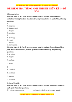 ĐỀ KIỂM TRA TIẾNG ANH BRIGHT GIỮA KÌ 1 – ĐỀ SỐ 1 I. Pronunciation