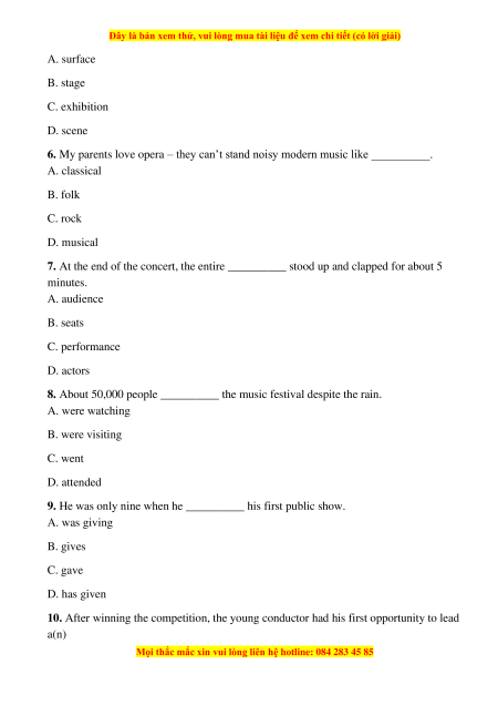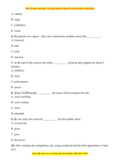 6. My parents love opera – they can’t stand noisy modern music like __________. A. classical B. folk C. rock D. musical