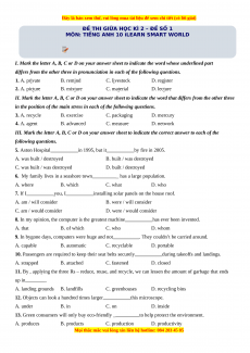 • Tailieugiaovien.com.vn giới thiệu 11 đề thi giữa kì 2 kèm file nghe môn Tiếng anh 10 ilearn smart world mới nhất nhằm giúp Giáo viên có thêm tài liệu tham khảo ra đề thi Tiếng anh lớp 10.